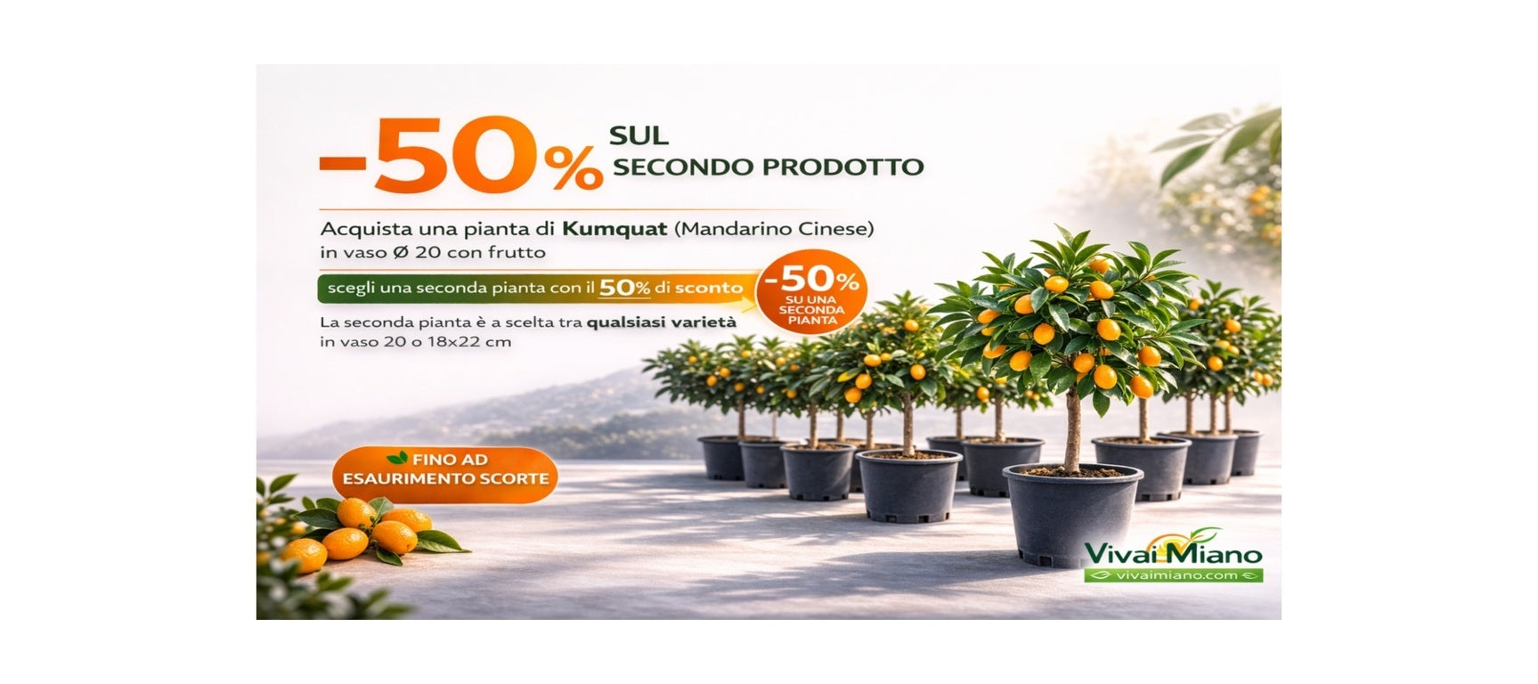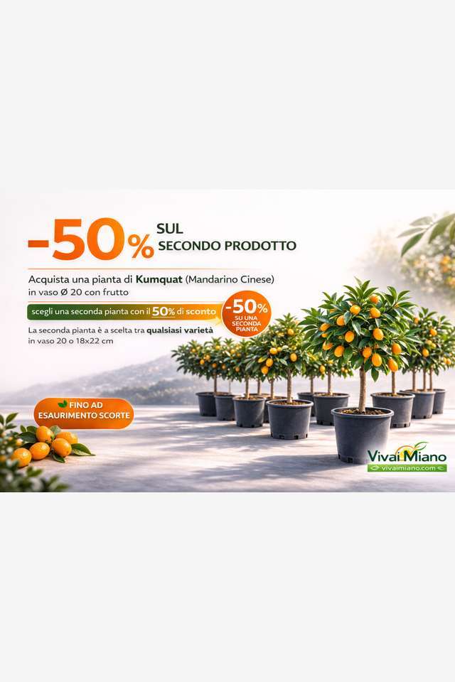 Acquista la nostra Pianta di Kumquat - Mandarino Cinese in vaso Ø 20 con frutto e abbinala a qualsiasi altra pianta in vaso 20 o vaso 18x22 per ottenere uno sconto del 50% sul secondo prodotto!